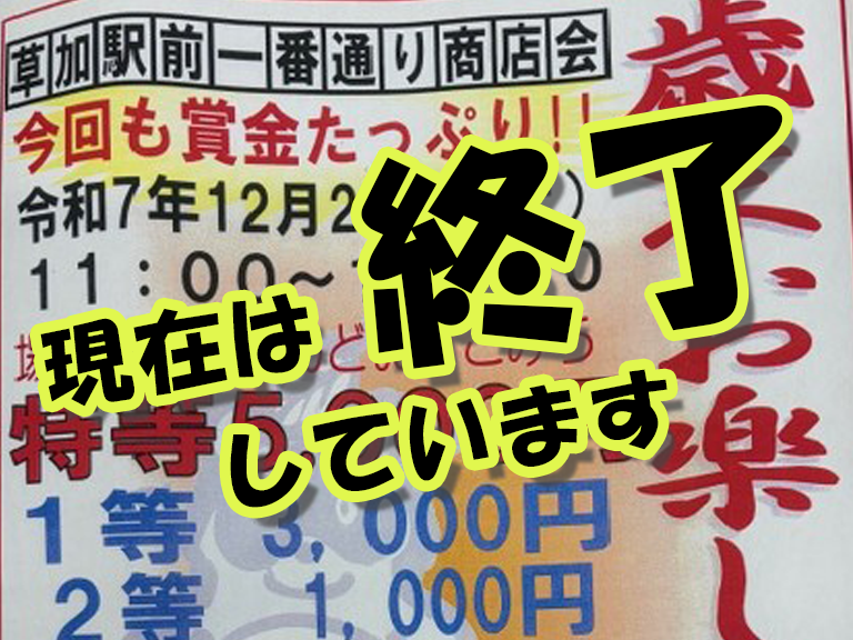 草加駅前一番通り商店会の「歳末お楽しみ抽選会」が今年も開催されます!今回も賞金たっぷり!みなさまでぜ […] -