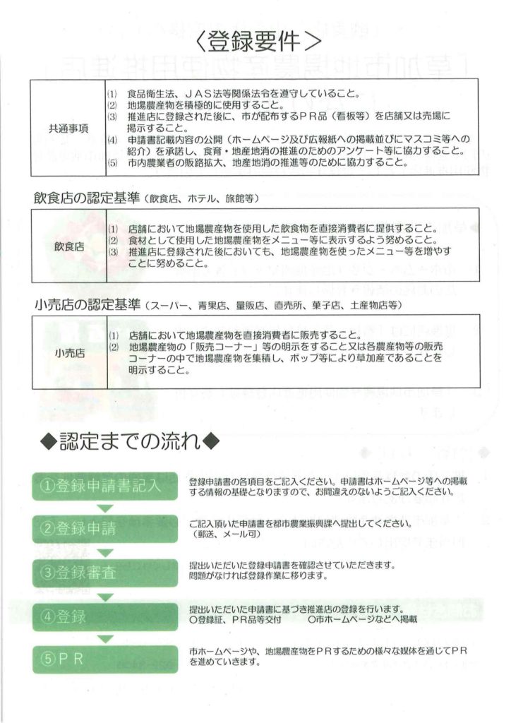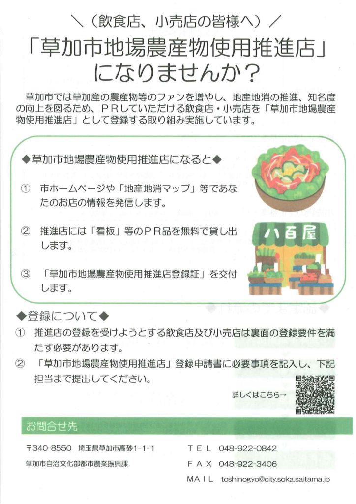 草加市では草加さんの農産物等のファンを増やし、地産地消の推進、知名度の向上を図るため、PRしていただける飲食店・小売店を「草加市地場農産物使用推進店」として登録する取り組みを実施しています。