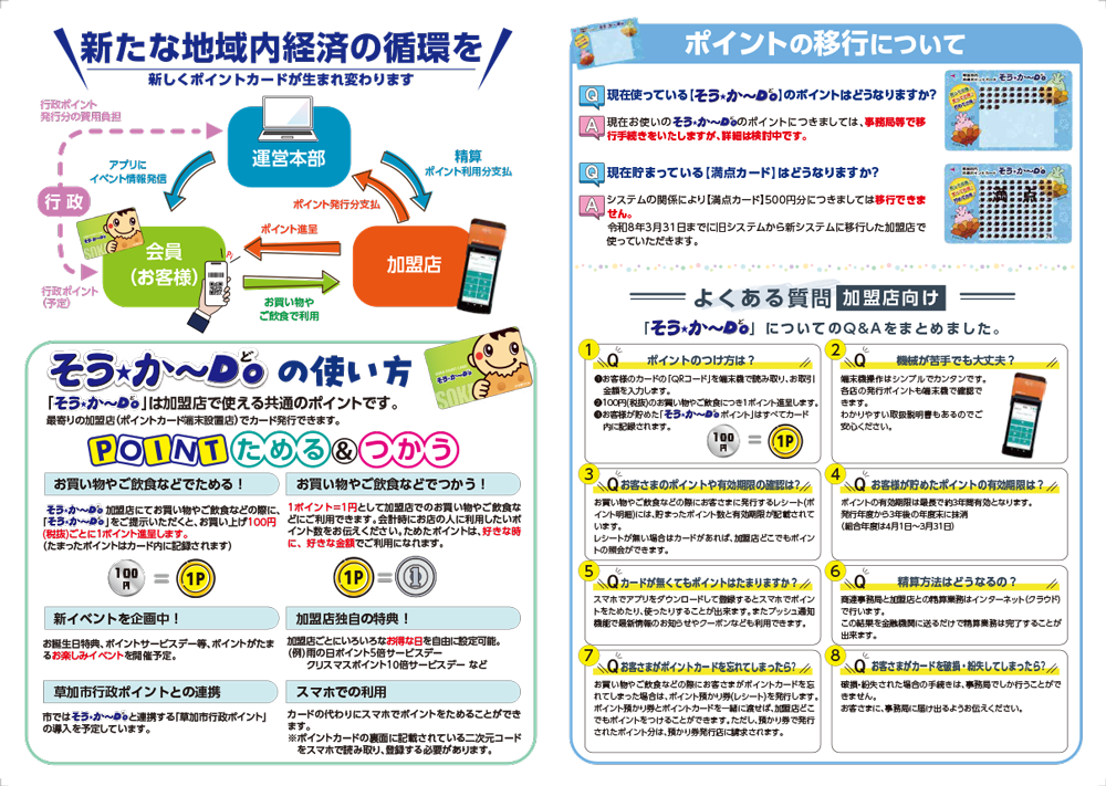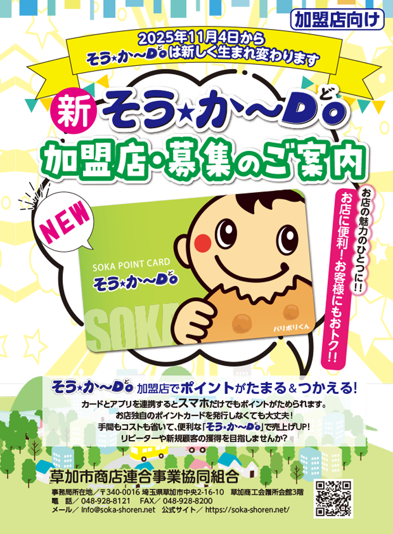 草加市商店連合事業協同組合では草加市内共通ポイントカード「そう★か~Do」加盟店を大募集しています。