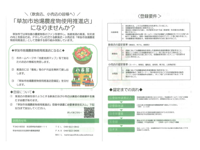【飲食店・小売店の皆様へ】草加市地場農産物使用推進店になりませんか?