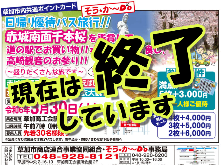 令和6年3月30日(土)、日帰りバス旅行を実施します! 赤城南面千本桜の鑑賞をはじめ、道の駅でのお買 […] -
