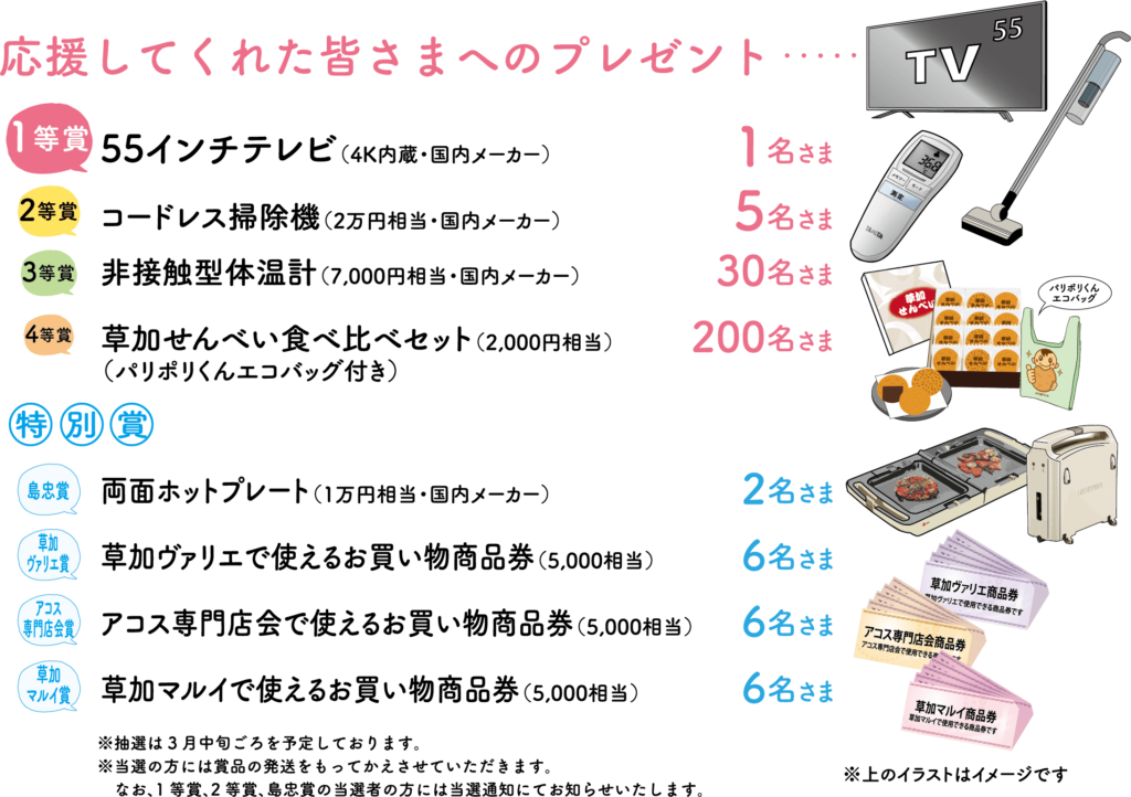 ※当選の方には賞品の発送をもってかえさせていただきます。なお、1等賞、2等賞、島忠賞の当選者の方には当選通知にてお知らせいたします。