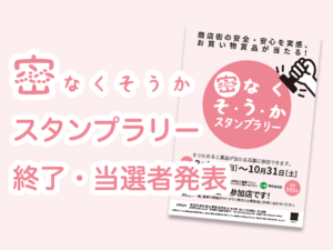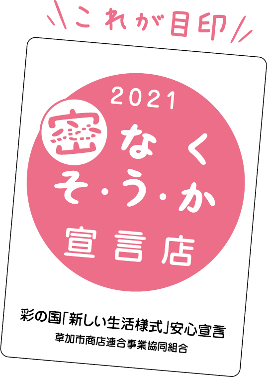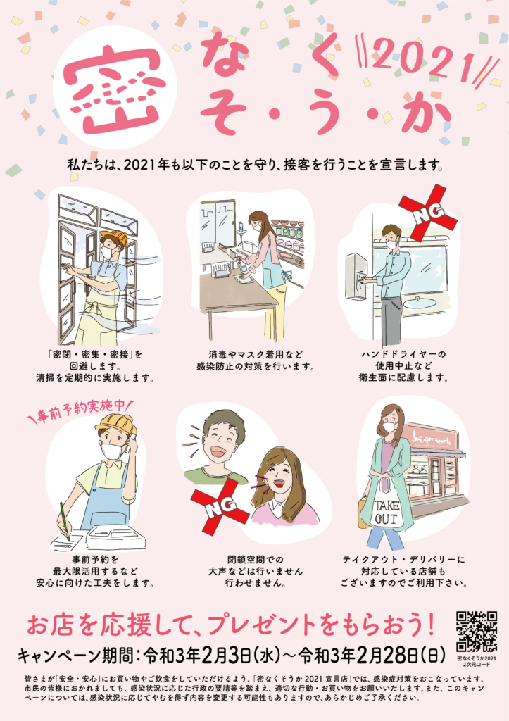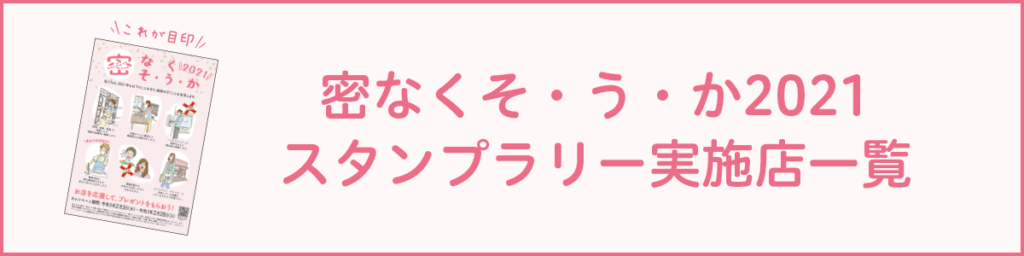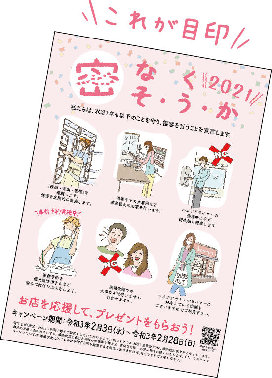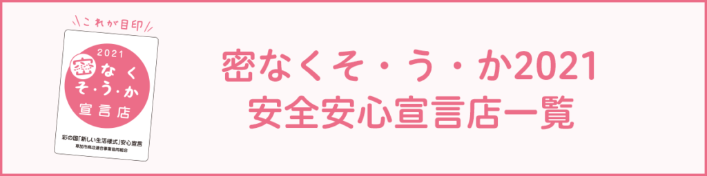 - ピンク色の(密なくそうか宣言店ステッカー)とピンク色の(密なくそうか2021チラシ)が目印です。