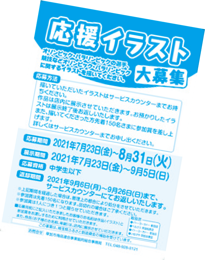 以下の取扱店に置いてある専用用紙に、オリンピック・パラリンピックの応援イラストを描いて、各店舗のサービスカウンターまでご提出ください。