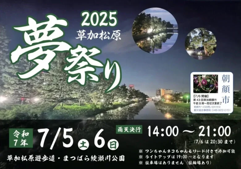 また、草加市観光協会も「第43回草加朝顔市」を同日開催しており、まつばら綾瀬川公園で朝顔の販売などが行われます。