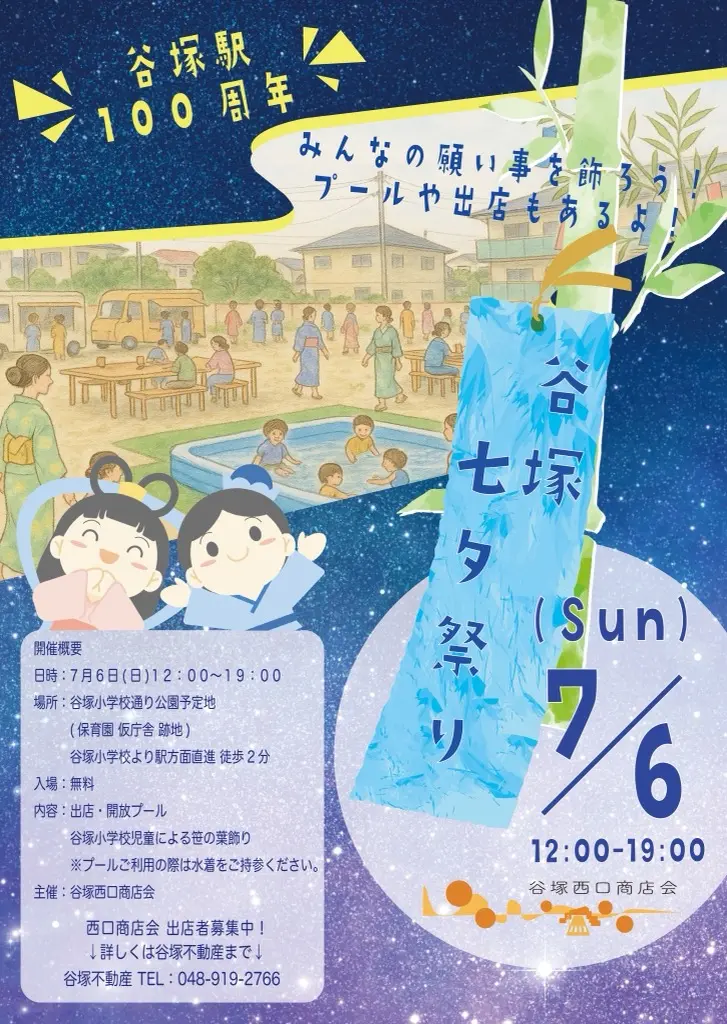 日時:2025年7月6日(日)12時~19時 場所:谷塚小学校通り公園予定地(保育園 仮庁舎 跡地) 入場料無料 内容:出店、開放プール、谷塚小学校児童による笹の葉飾り (※プールご利用の方は水着をご持参ください。) 主催:谷塚西口商店会